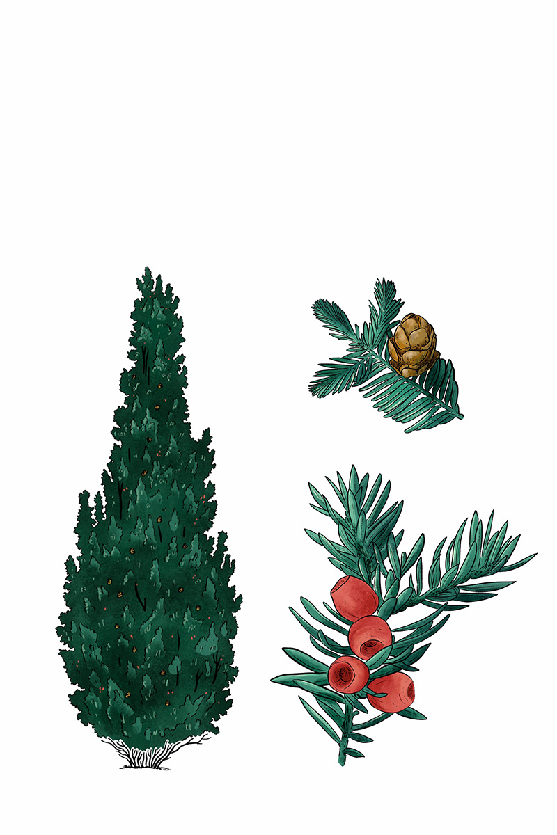 Gli aghi crescono in file ordinate lungo i rametti e formano masse compatte di colore verde scuro, adatte a creare strutture fitte e continue, che modulano lo spazio e la luce. Le piccole bacche rosse, dette arilli, sono in realtà involucri carnosi che circondano il seme: attraenti per gli uccelli, che ne consumano solo la polpa. Così come le foglie e la corteccia, i semi contengono infatti sostanze velenose, che contribuiscono alla fama ambivalente della pianta. Questa combinazione di aspetto essenziale e potenziale pericolo ha alimentato nel tempo l’aura simbolica del tasso, spesso presente in luoghi di riflessione o memoria.